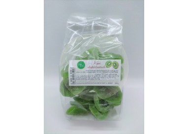 Ingredientes: Kiwi en rodajas, ácido cítrico E-330, azúcar glasé, conservador E220. Colorante (E133 y E102). Sin gluten. Alérgeno: sulfitos.